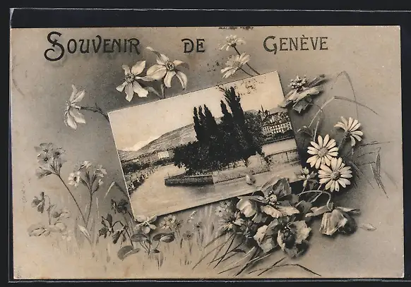 AK Genève, Partie am Wasser umrahmt von floraler Darstellung