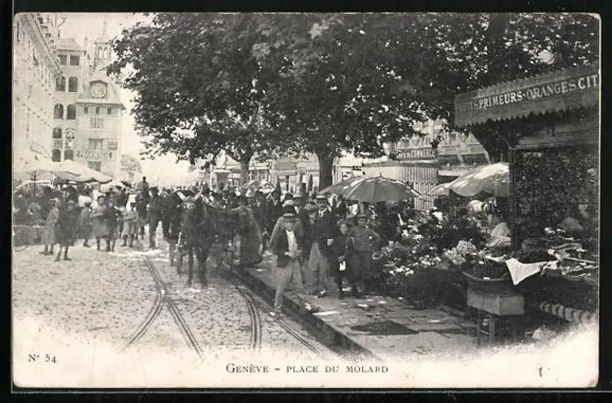 AK Geneve, Place du Molard, Marktszene, Pferdekutsche
