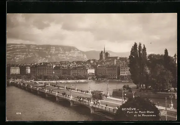 AK Genève, Pont du Mont-Blanc et Ile Rousseau, Strassenbahn