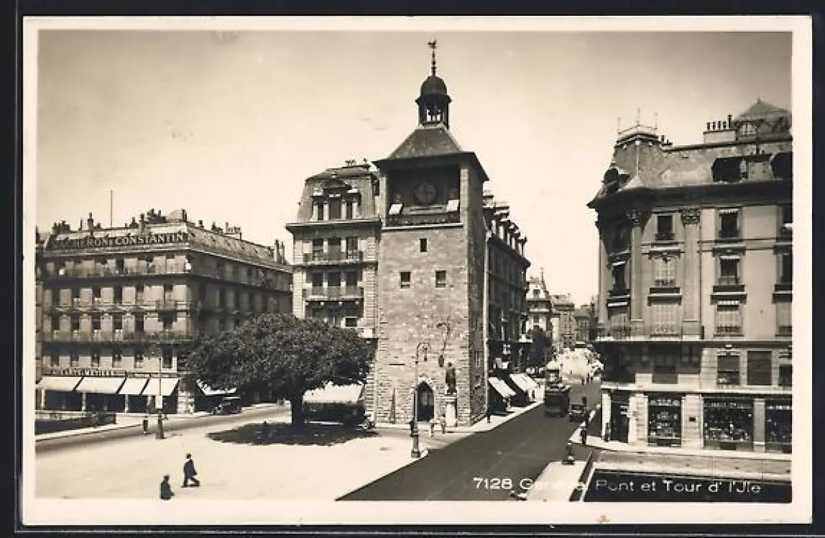 AK Genève, Pont et Tour de l`Ile, Strassenbahn
