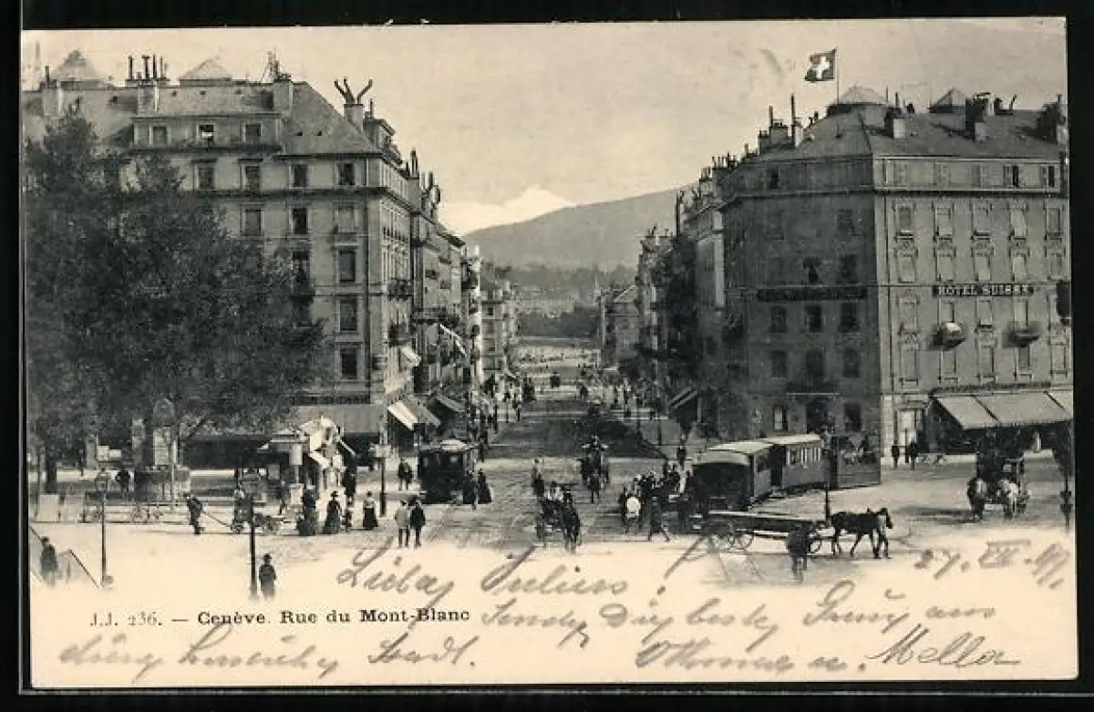 AK Genéve, Rue du Mont-Blanc, Strassenbahn