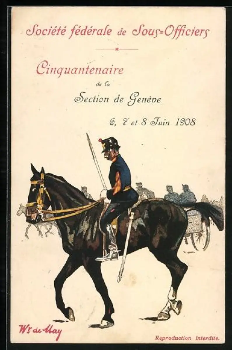 AK Genève, Société fédérale de Sous-Officiers, Cinquantenaire de la Section Genéve 6,7 et 8 Juin 1908, Soldat auf Pferd