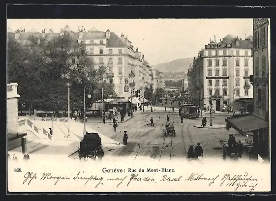 AK Geneve, Strassenbahn passiert das Hotel Suisse, Rue du Mont-Blanc