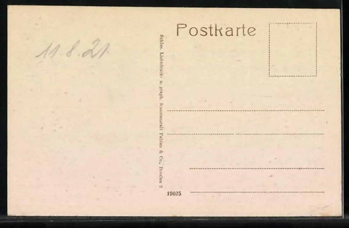 Personenbezogene Daten auf der Rückseite der Karte wurden durch blauen Textmarker unkenntlich gemacht. Die blauen Stellen sind auf die Vorderseite durchgeweicht und wirken sich negativ auf das Postkartenfoto aus