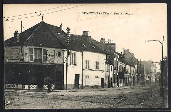 AK Gennevilliers, Rue St-Denis avec voies de tramway et bâtiments anciens