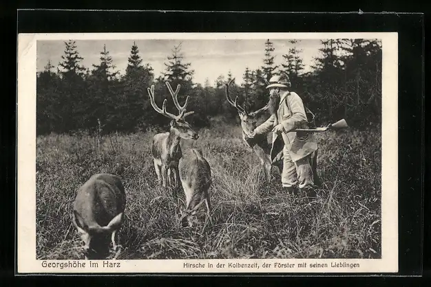 AK Georgshöhe /Harz, Hirsche in der Kolbenzeit mit Förster