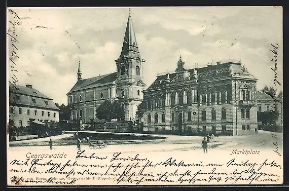 AK Georgswalde, Marktplatz mit Stadtamt und Kirche