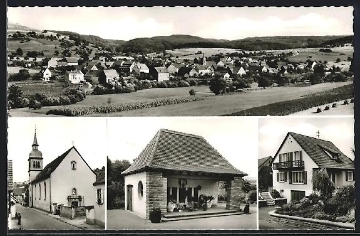 AK Gerbach /Pfalz, Ortsansicht aus der Vogelschau, Partie an der Kirche, Ehrenmal