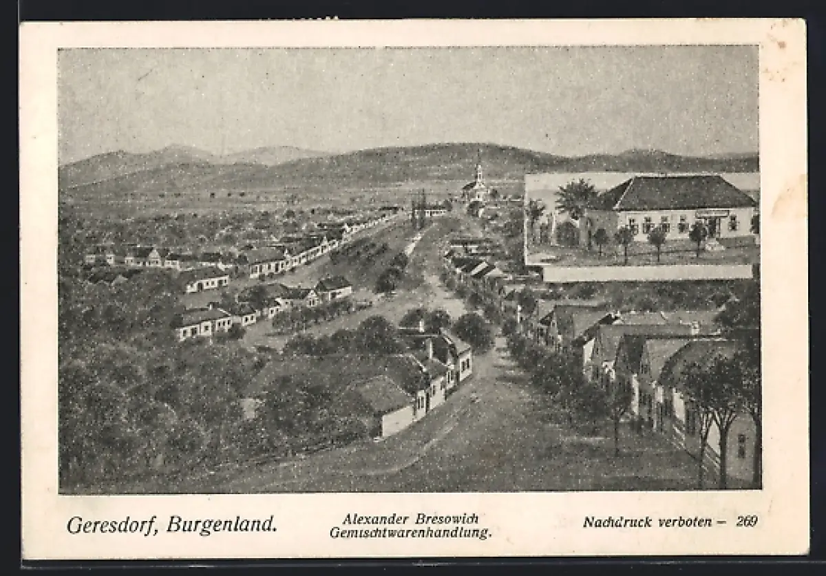 AK Gerersdorf /Burgenland, Gemischtwaren A. Bresowich, Ortsansicht mit Kirche