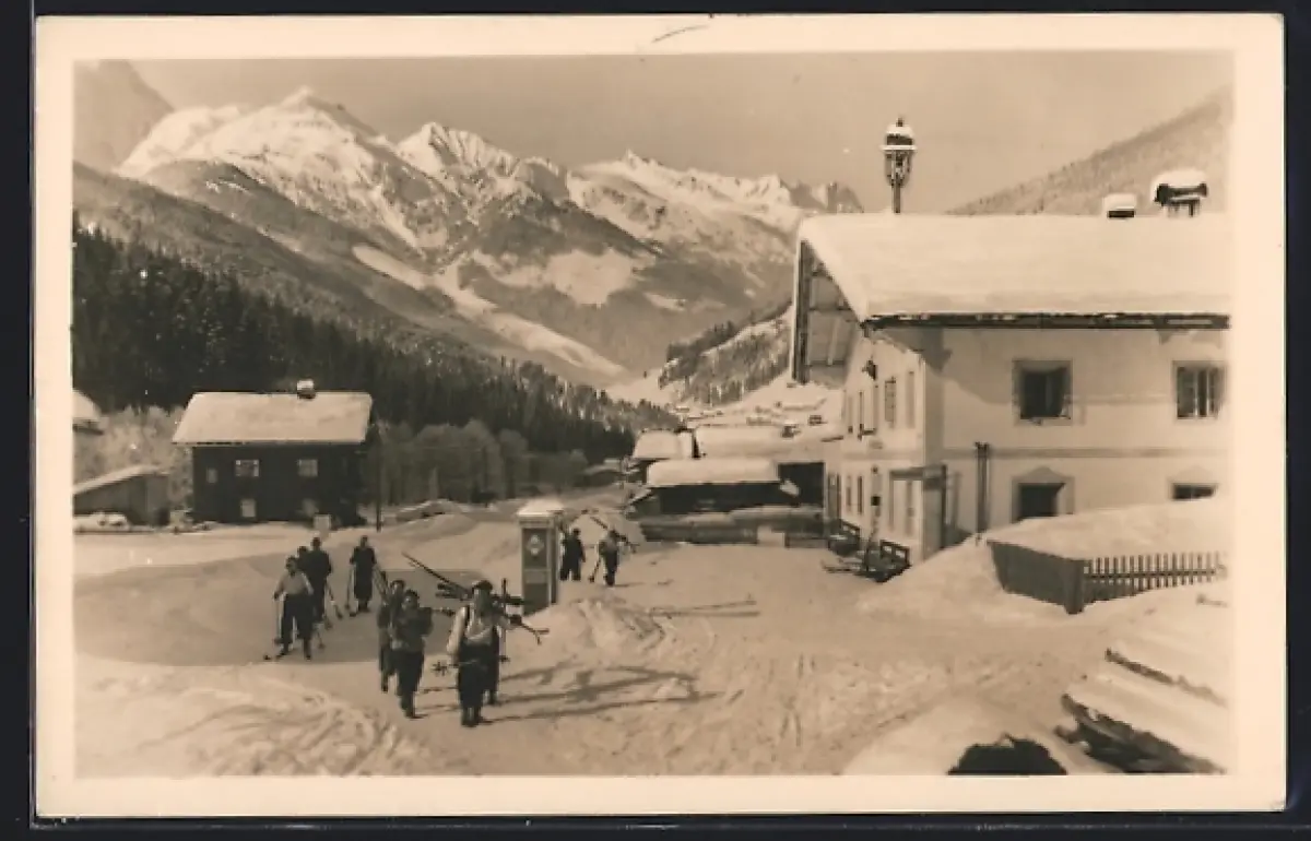 AK Gerlos, Ortsansicht mit Gasthof Oberwirt im Winter, Skifahrer