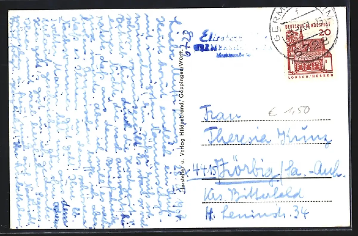 Personenbezogene Daten auf der Rückseite der Karte wurden durch blauen Textmarker unkenntlich gemacht. Die blauen Stellen sind auf die Vorderseite durchgeweicht und wirken sich negativ auf das Postkartenfoto aus