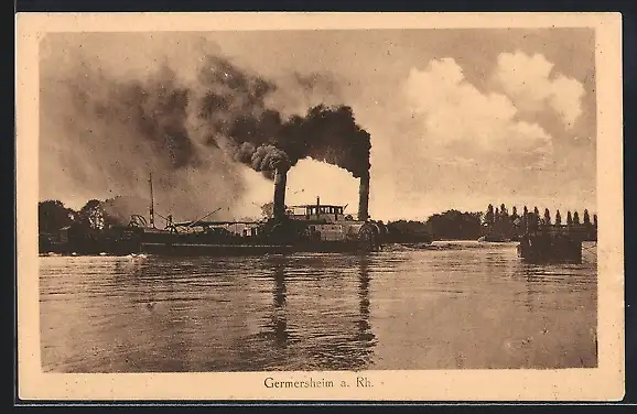 AK Germersheim am Rhein, Raddampfer mit rauchenden Schloten fährt an der Ortschaft vorbei