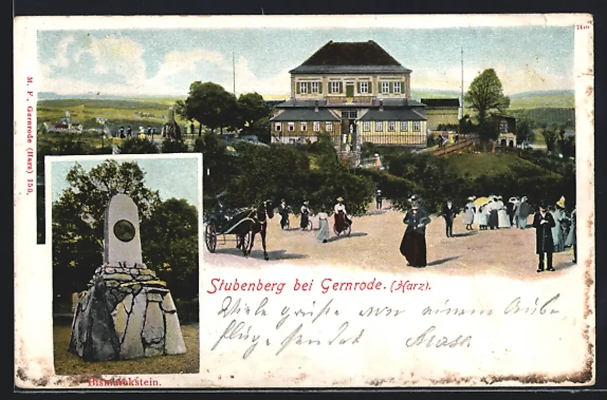 AK Gernrode /Harz, Hotel Stubenberg mit Pferdewagen, Bismarckstein