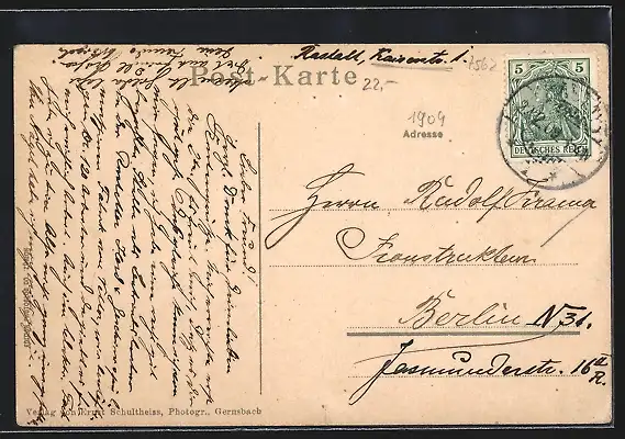 alte Ansichtskarte, gelaufen 1909, Eckknick oben li., guter Zustand