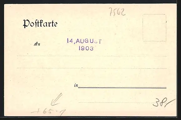 Personenbezogene Daten auf der Rückseite der Karte wurden durch blauen Textmarker unkenntlich gemacht. Die blauen Stellen sind auf die Vorderseite durchgeweicht und wirken sich negativ auf das Postkartenfoto aus