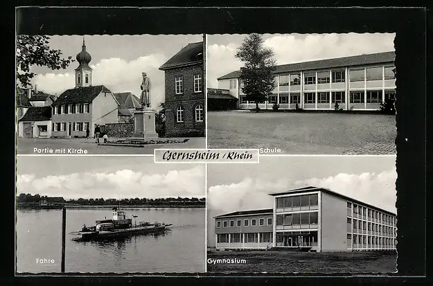 AK Gernsheim / Rhein, Ortsansicht mit Kirche, Gymnasium und Fähre