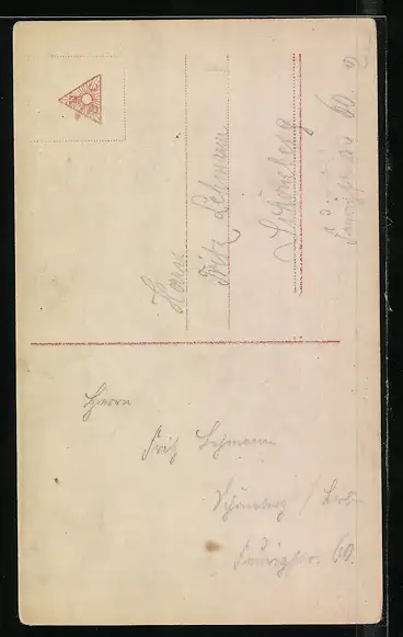 Personenbezogene Daten auf der Rückseite der Karte wurden durch blauen Textmarker unkenntlich gemacht. Die blauen Stellen sind auf die Vorderseite durchgeweicht und wirken sich negativ auf das Postkartenfoto aus