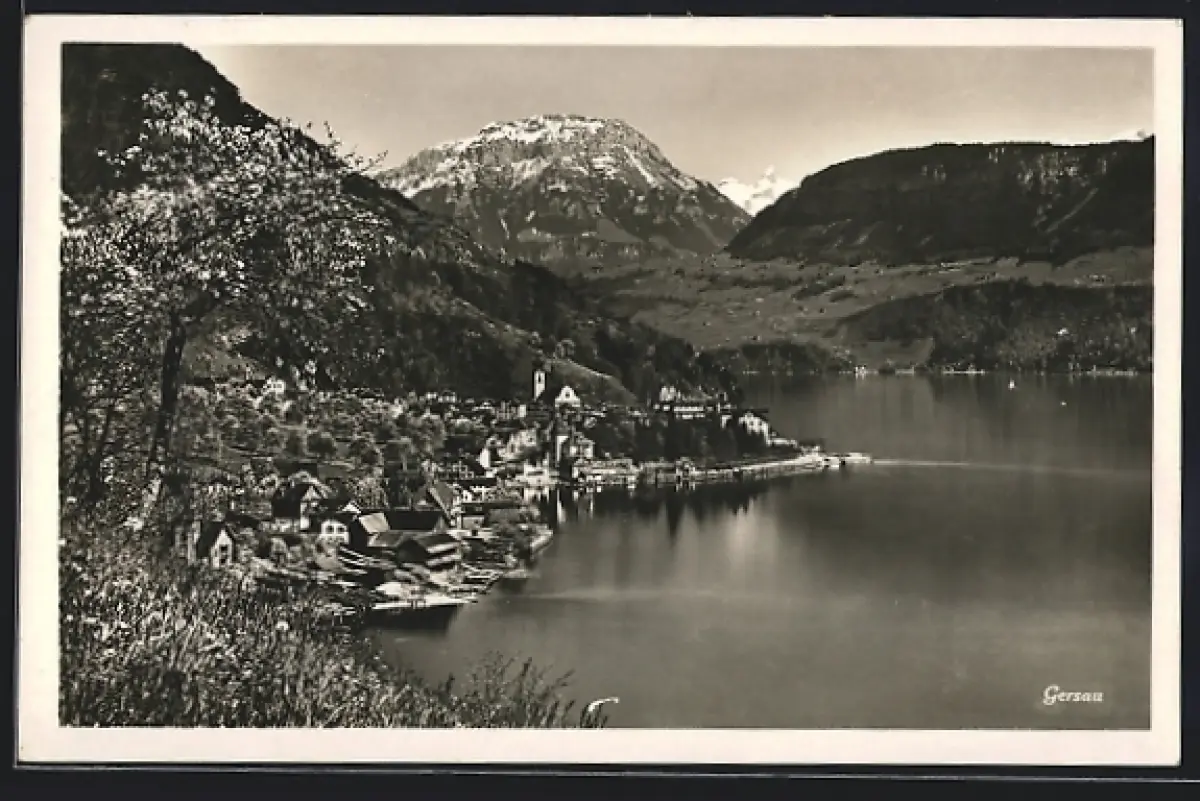AK Gersau, Totalansicht mit Gewässer u. Bergen
