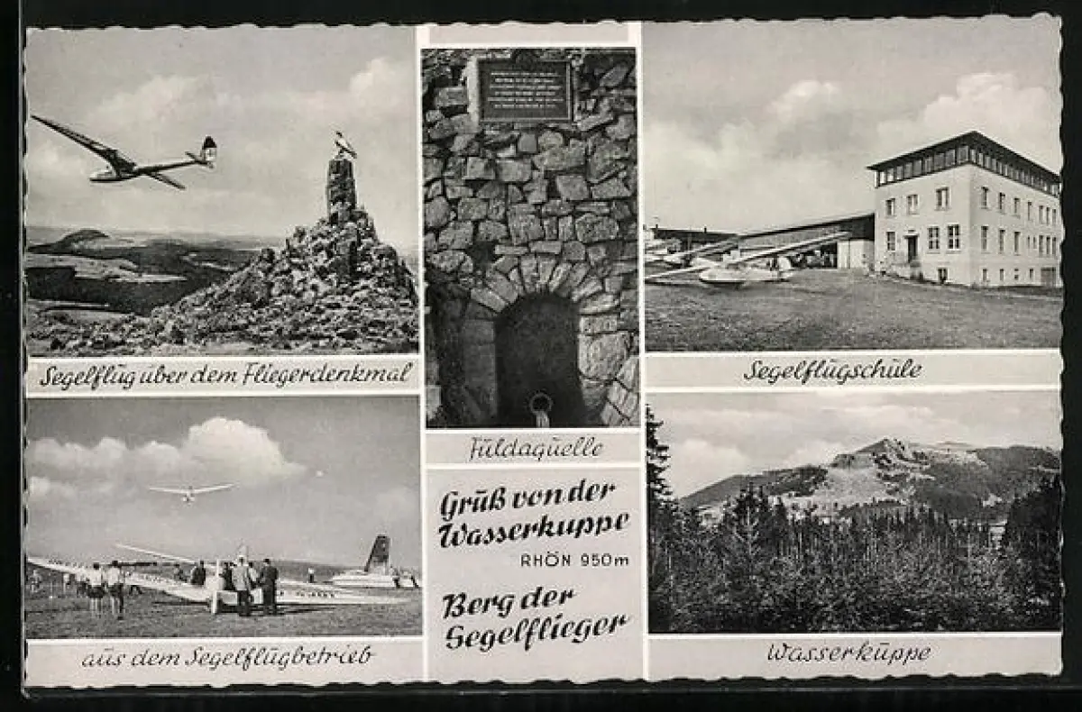 AK Gersfeld / Rhön, Segelflugzeug über dem Fliegerdenkmal, Segelflugschule, Wasserkuppe, Segelflieger am Boden
