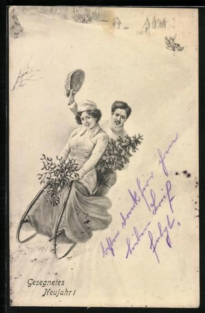 AK Gesegnetes Neujahr, Paar fährt mit einem Schlitten den Hang hinab