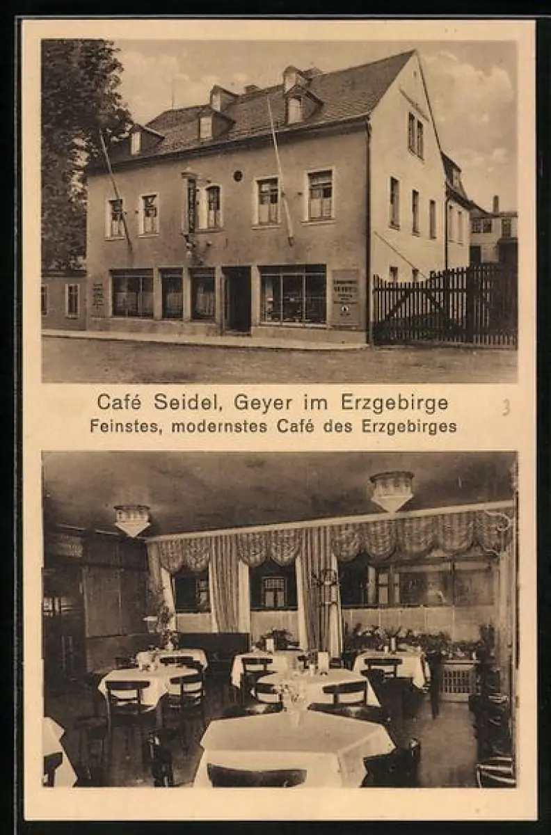 AK Geyer i. Erzgeb., Cafe Seidel, Aussen- und Innenansicht