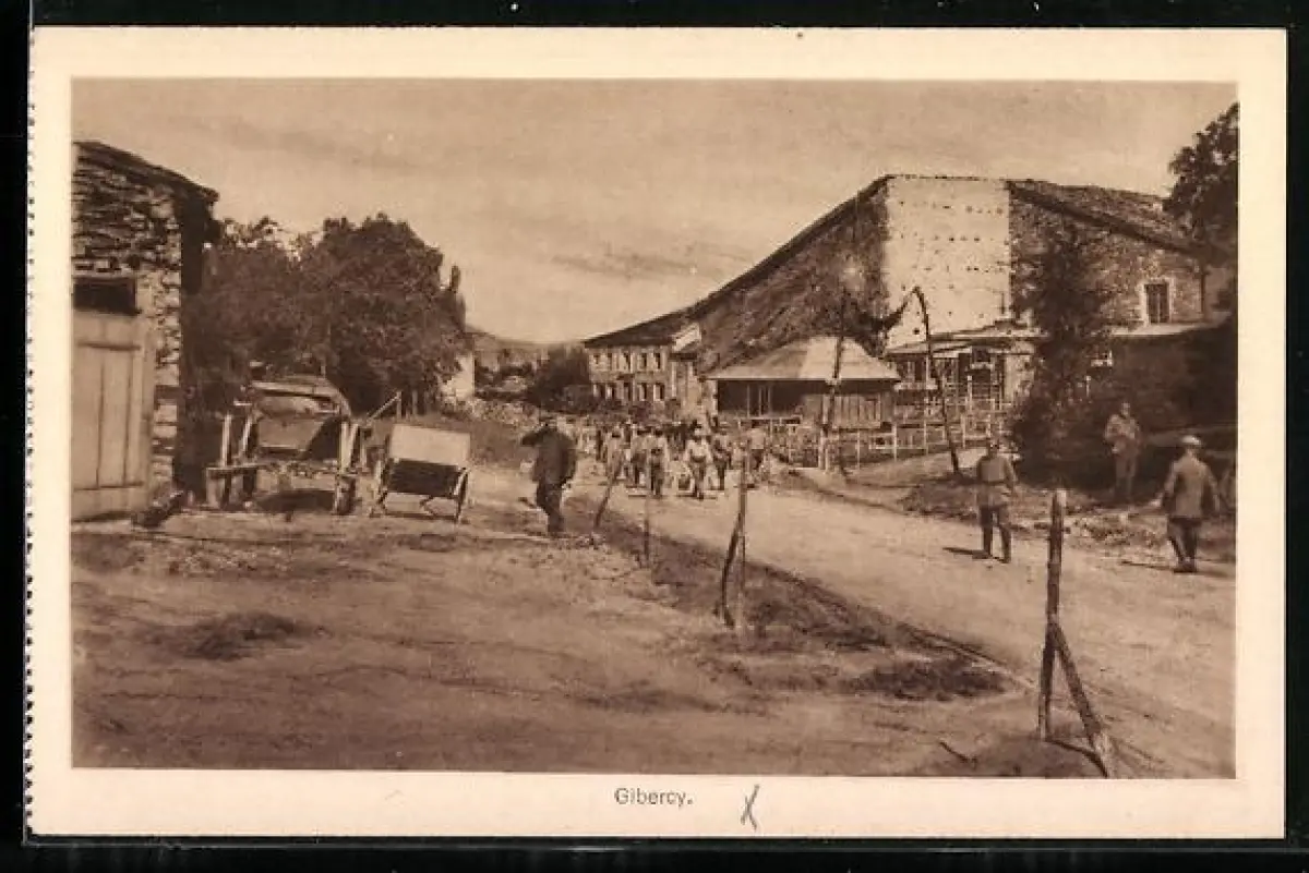 AK Gibercy, Scène de rue animée avec villageois et bâtiments rustiques
