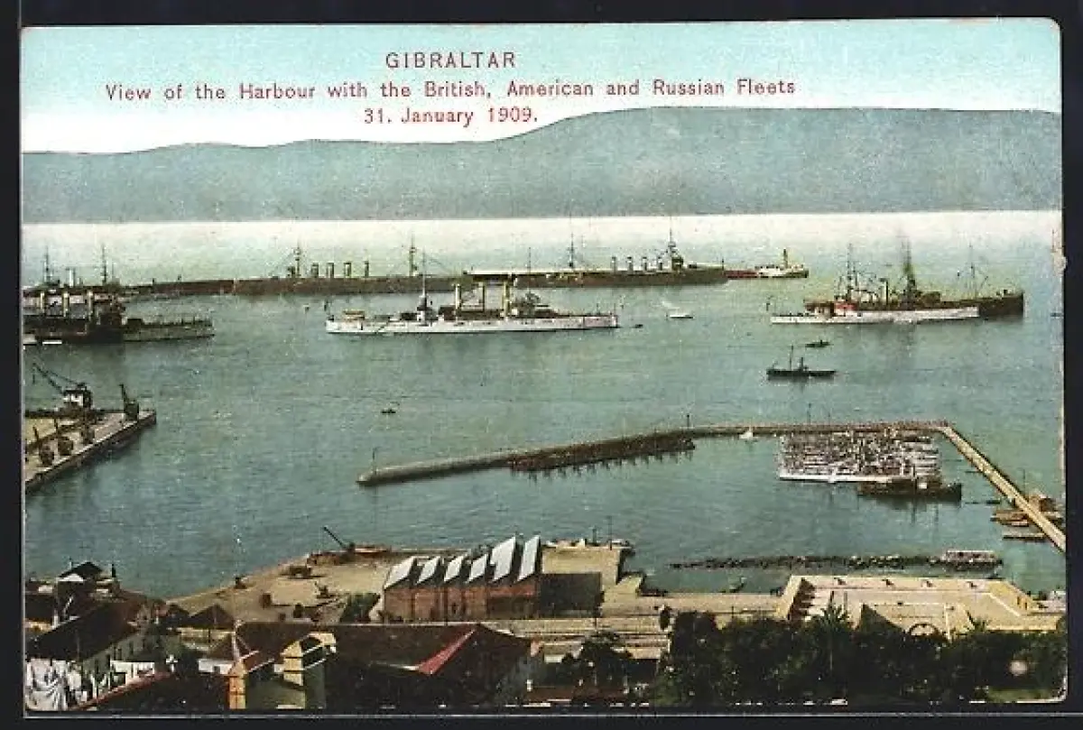 AK Gibraltar, View of the Harbour with the British, American, and Russian Fleets 1909