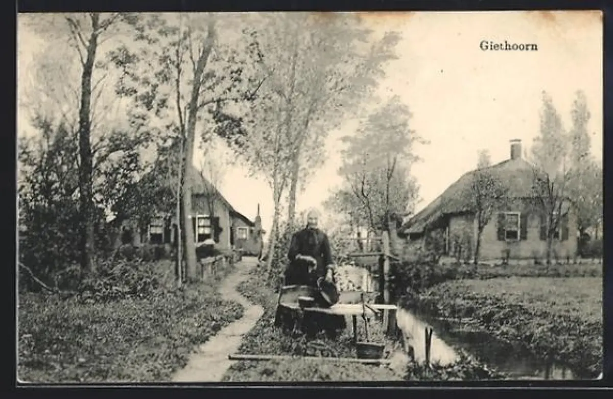 AK Giethoorn, Uferpartie mit Wäscherin in Tracht, Häuser