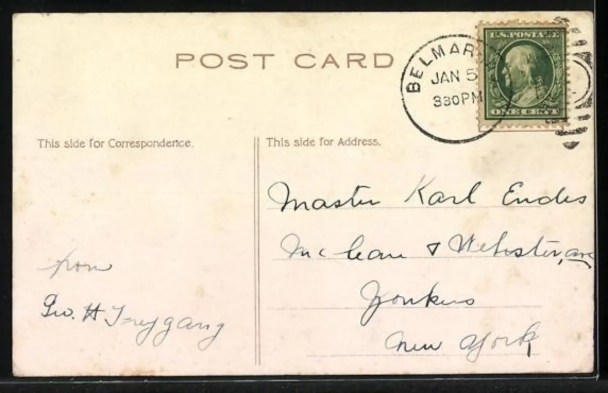 Personenbezogene Daten auf der Rückseite der Karte wurden durch blauen Textmarker unkenntlich gemacht. Die blauen Stellen sind auf die Vorderseite durchgeweicht und wirken sich negativ auf das Postkartenfoto aus