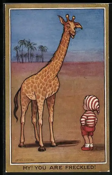 AK Giraffe und Kind in gestreifter Kleidung