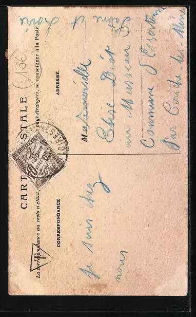Personenbezogene Daten auf der Rückseite der Karte wurden durch blauen Textmarker unkenntlich gemacht. Die blauen Stellen sind auf die Vorderseite durchgeweicht und wirken sich negativ auf das Postkartenfoto aus