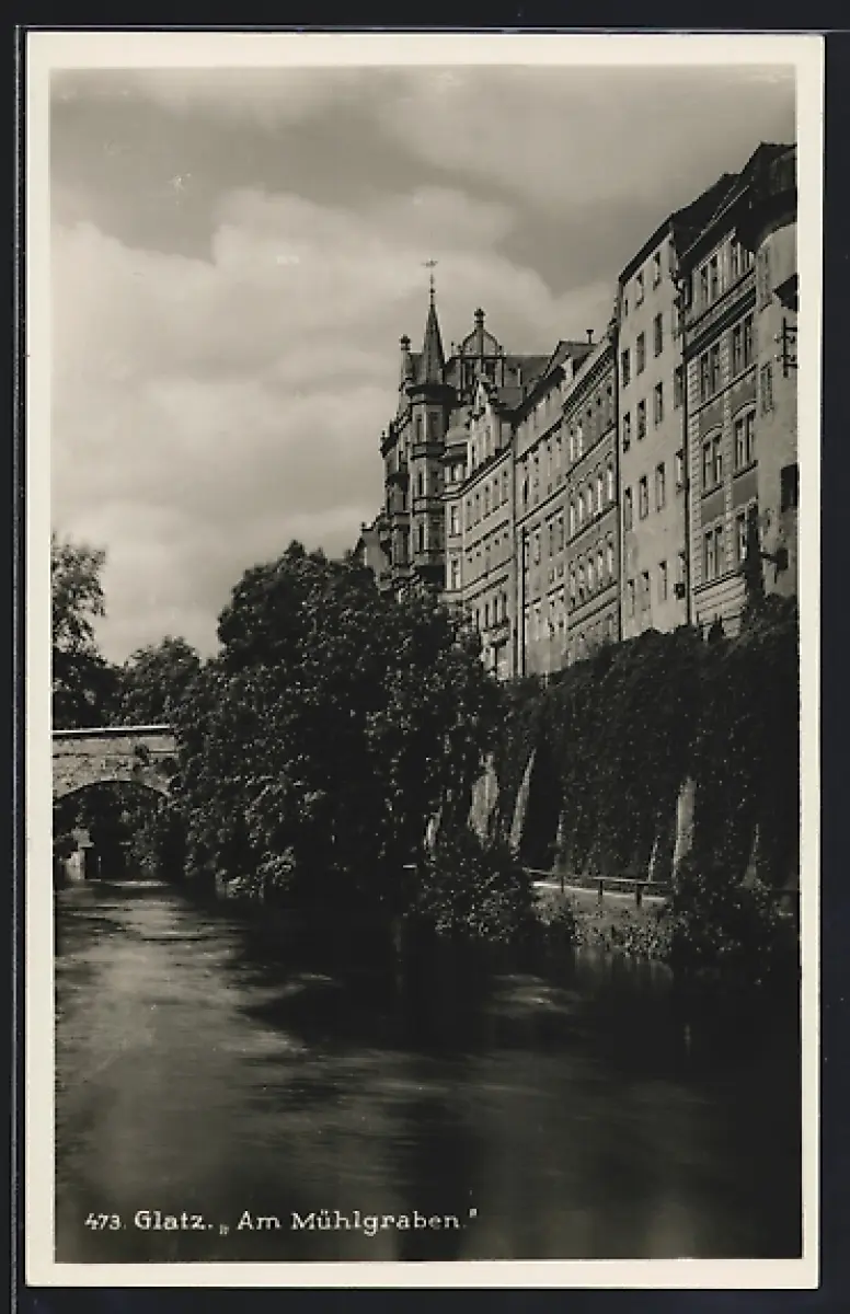 AK Glatz, Am Mühlgraben mit Steinbrücke und Häuserfassaden