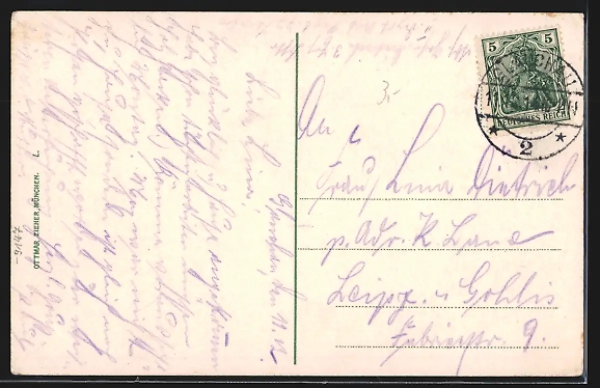 Personenbezogene Daten auf der Rückseite der Karte wurden durch blauen Textmarker unkenntlich gemacht. Die blauen Stellen sind auf die Vorderseite durchgeweicht und wirken sich negativ auf das Postkartenfoto aus
