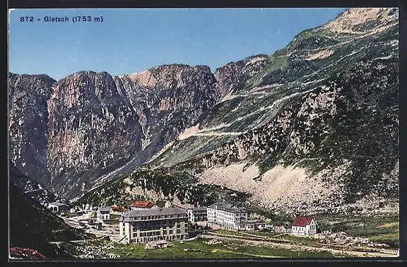 AK Gletsch, Ortsansicht mit Gebirgspanorama
