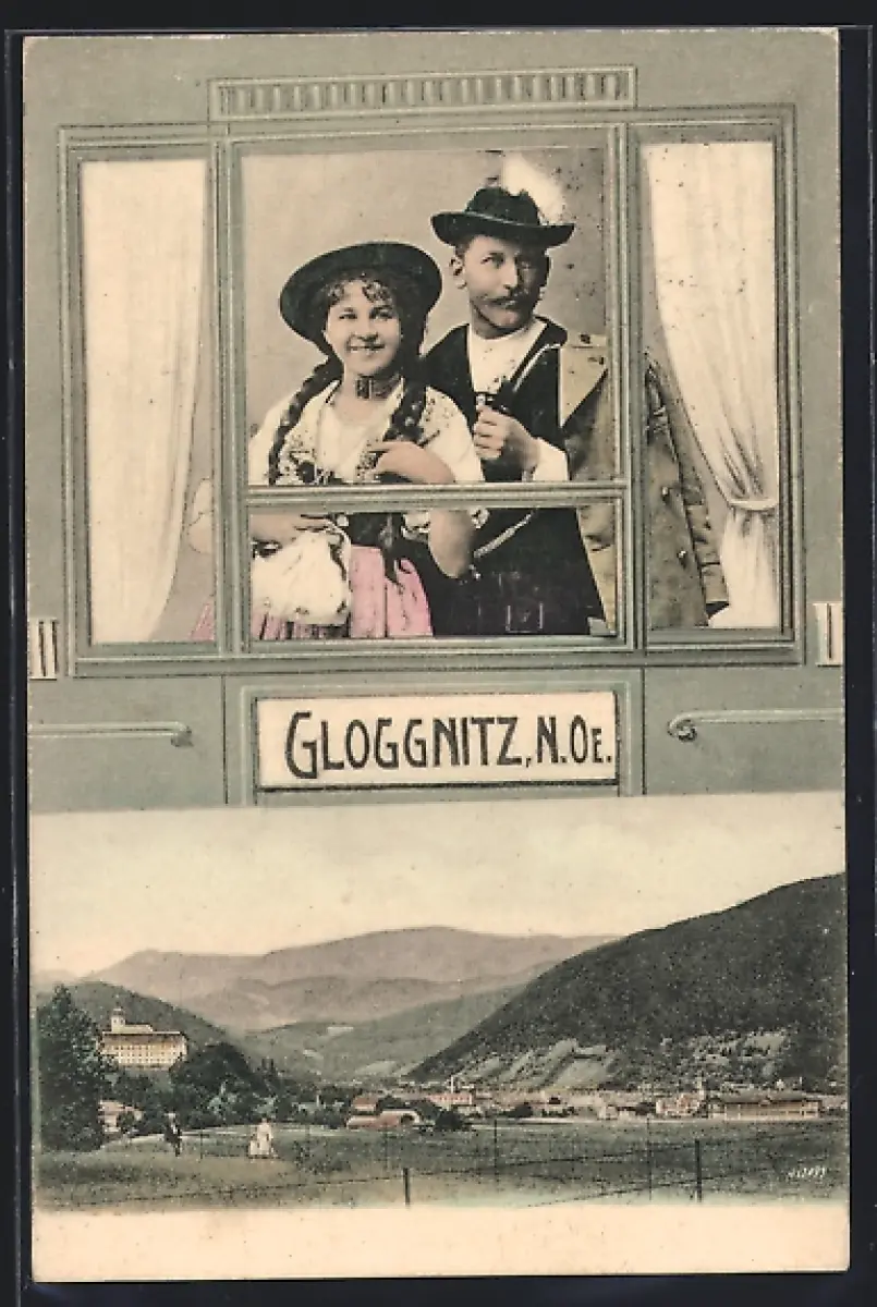 AK Gloggnitz /N. Oe., Ortsansicht aus der Vogelschau, Paar in Tracht