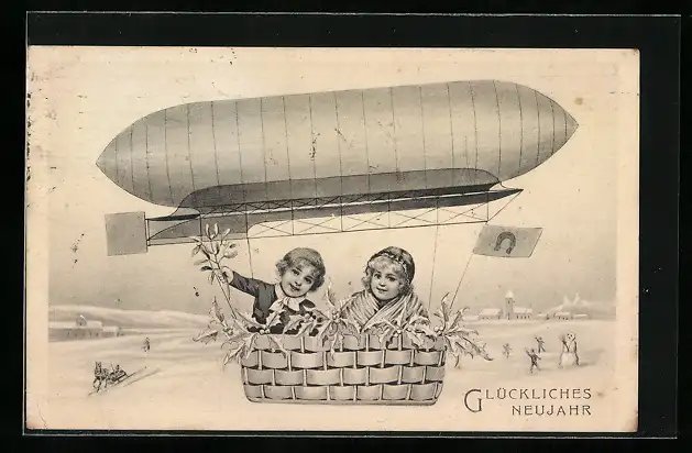 AK Glückliches Neujahr, Kinder in Luftschiff