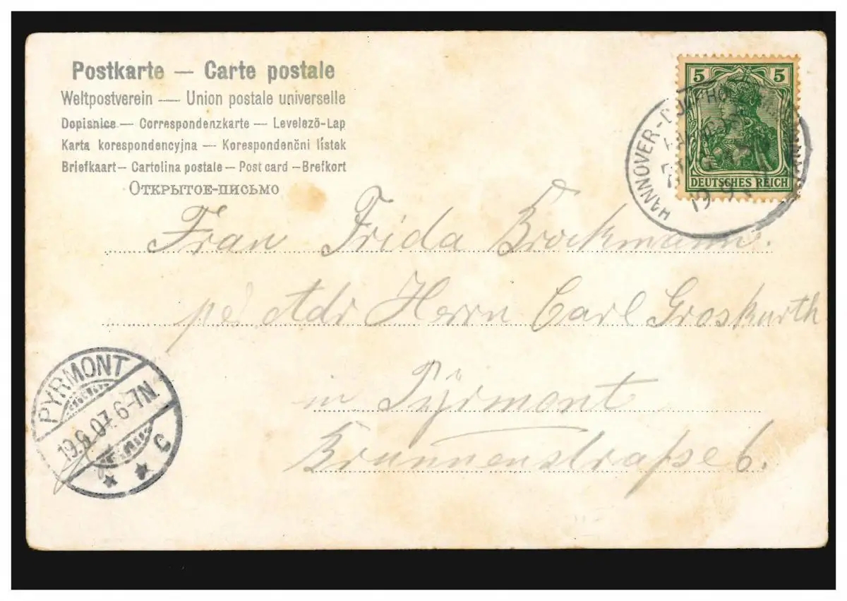 per Bahnpost HANNOVER-BUCHHOLZ ... ZUG ... 19.9.1907, Ankunftsstempel PYRMONT 19.9.07