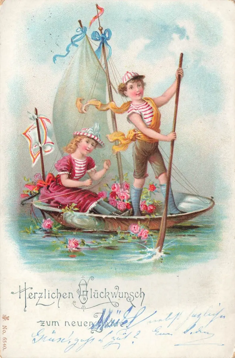 AK Glückwunsch neuen Jahre Kinder Boot Postkarte Plauen 1902