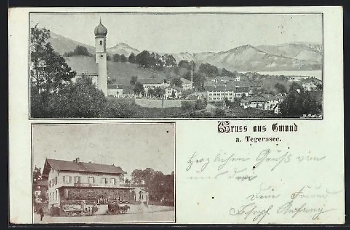 AK Gmund a. Tegernsee, Gasthaus, Teilansicht mit Kirche