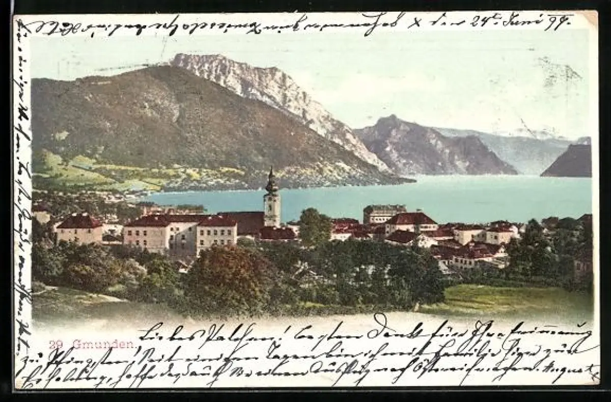 AK Gmunden, Ortsansicht mit Blick auf den See und das Bergpanorama