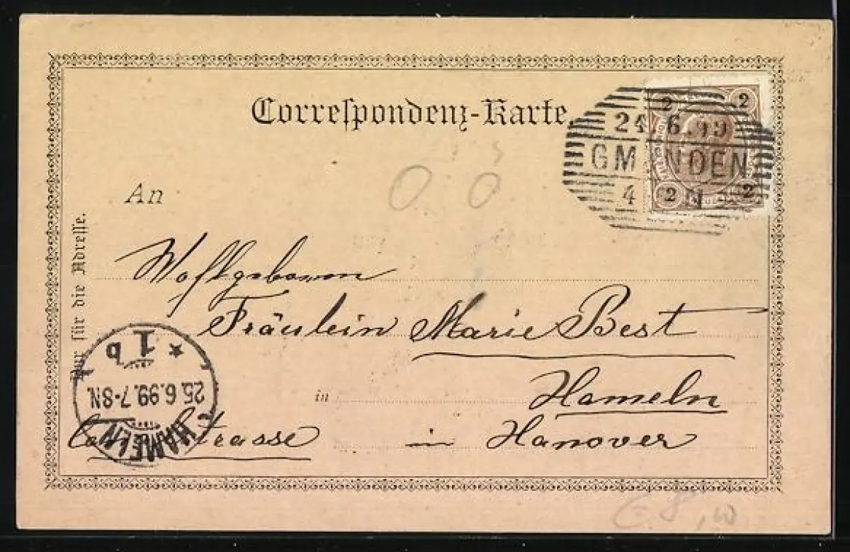 gelaufen 1899, Eckknick rechts oben, guter Zustand
