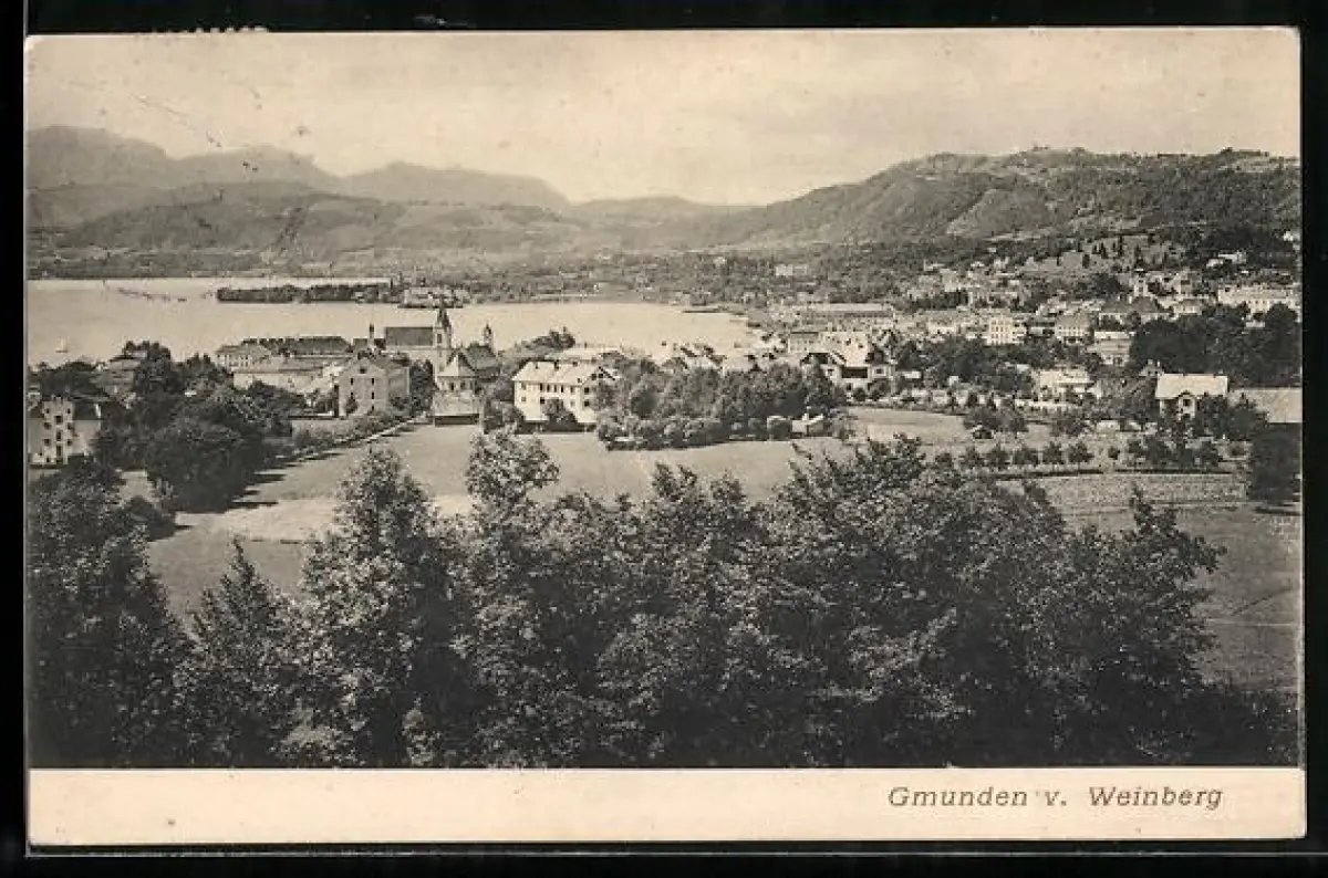AK Gmunden, Panorama vom Weinberg mit See, Ort und Kirche