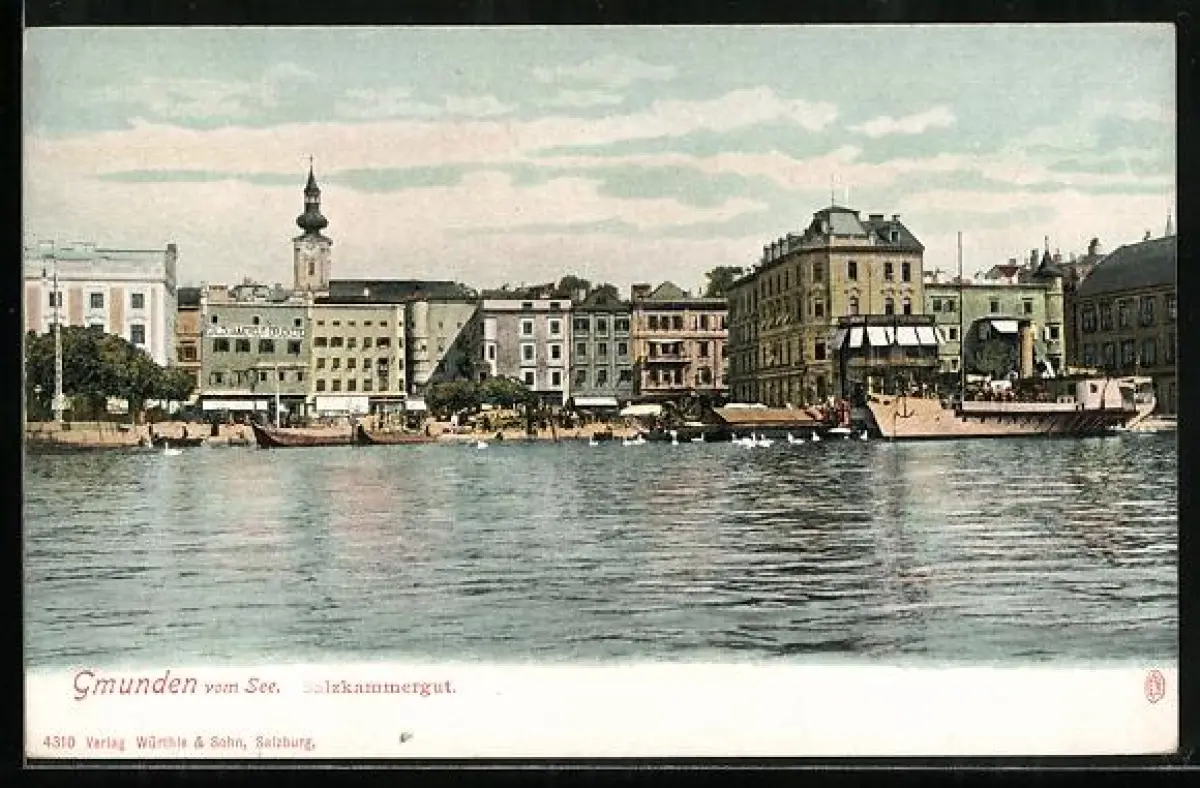 AK Gmunden /Salzkammergut, Uferpartie mit Schiff, Häuserzeile und Kirchturm