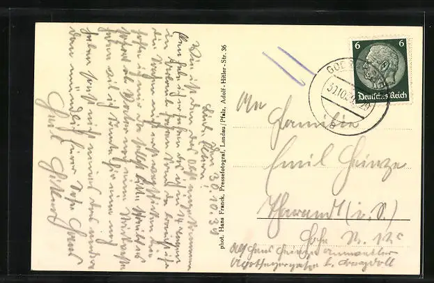 Personenbezogene Daten auf der Rückseite der Karte wurden durch blauen Textmarker unkenntlich gemacht. Die blauen Stellen sind auf die Vorderseite durchgeweicht und wirken sich negativ auf das Postkartenfoto aus