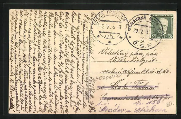 Personenbezogene Daten auf der Rückseite der Karte wurden durch blauen Textmarker unkenntlich gemacht. Die blauen Stellen sind auf die Vorderseite durchgeweicht und wirken sich negativ auf das Postkartenfoto aus