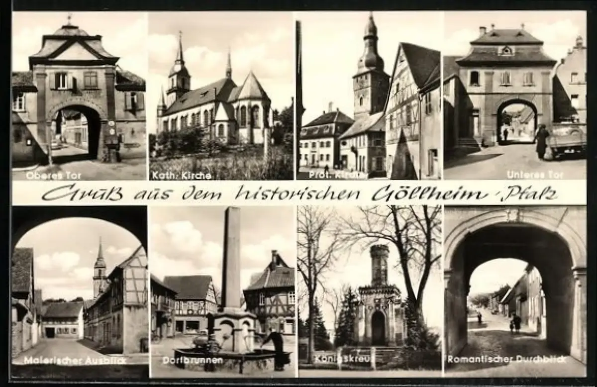 AK Göllheim /Pfalz, Oberes Tor, Kath. Kirche, Prot. Kirche, Unteres Tor, Dorfbrunnen, Königskreuz