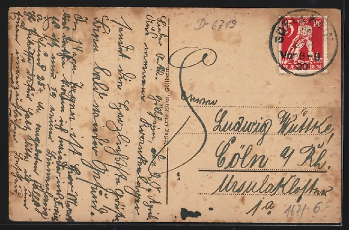 Personenbezogene Daten auf der Rückseite der Karte wurden durch blauen Textmarker unkenntlich gemacht. Die blauen Stellen sind auf die Vorderseite durchgeweicht und wirken sich negativ auf das Postkartenfoto aus