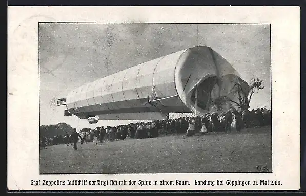 AK Göppingen, Landung 1909, Graf Zeppelins Luftschiff verfängt sich mit der Spitze in einem Baum