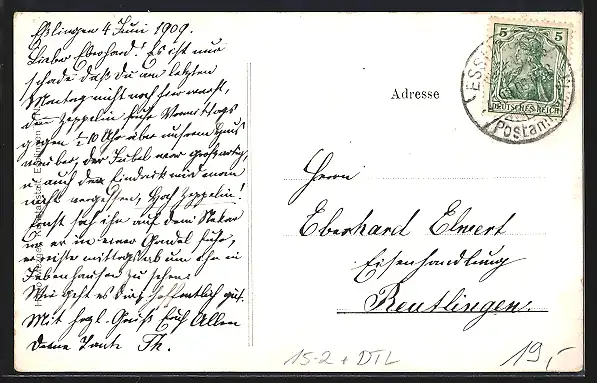 gelaufen 1909, Eckknick re. unten, guter Zustand