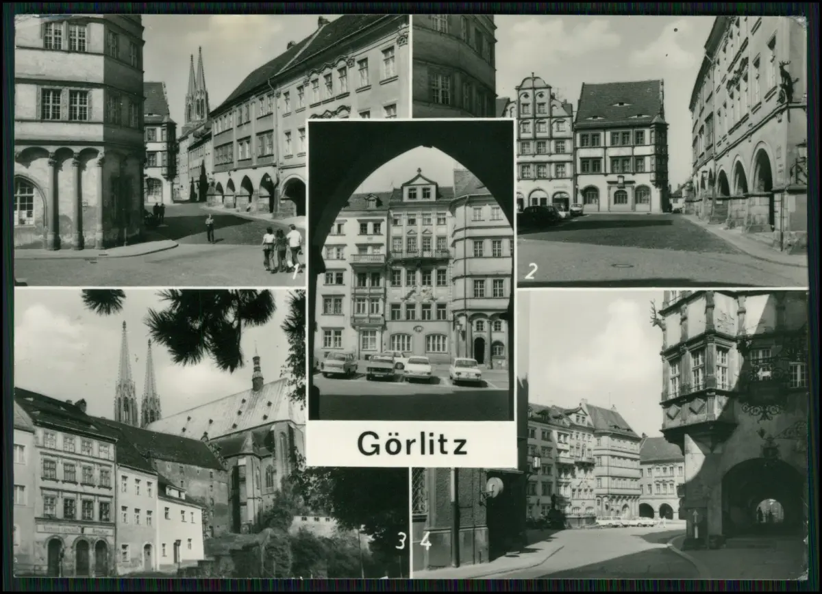 Mehrmotivkarte aus Görlitz mit markanten Gebäuden der Altstadt: Untermarkt, historische Struve Apotheke und Hirschlauben, Blick auf die Peterskirche sowie der Schönhof, eines der ältesten Renaissancebauten Deutschlands.